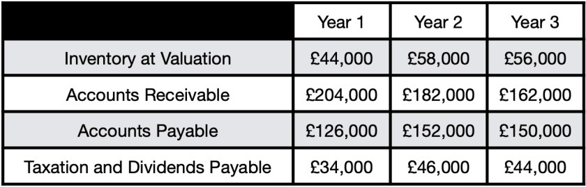 - Correct – Year 1 (£44k + £204k / £126k + £34k) = 1.55, Year 2 (£58k + £182k / £152k + £46k) = 1.21, Year 3 (£56k + £162k / £150k + £44k) = 1.12